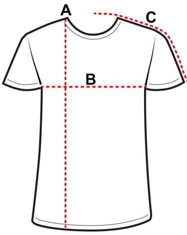 A Length: Place the end of the tape beside the collar at the top of the tee (Highest Point Shoulder). Pull the tape measure to the bottom of the shirt.